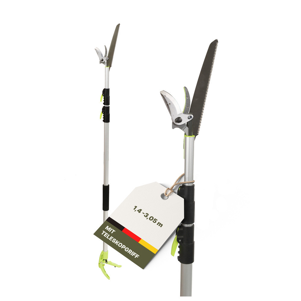 Die Teleskop-Astschere 1,4-3,05 m oliv ist das ideale Werkzeug für hohe Gartenarbeiten. Mit ihrem verstellbaren Teleskopgriff erreichen Sie mühelos auch hohe Äste, ohne eine Leiter zu benötigen. Die scharfen Klingen sorgen für präzise Schnitte, während der ergonomische Griff eine komfortable Handhabung ermöglicht. Das leichte Design sorgt für einfaches Arbeiten, selbst bei längeren Einsätzen. Perfekt für Baumschnitt, Sträucherschneiden und Gartenpflege - mit der Teleskop-Astschere erledigen Sie Ihre Gartenarbeiten effizient und sicher.