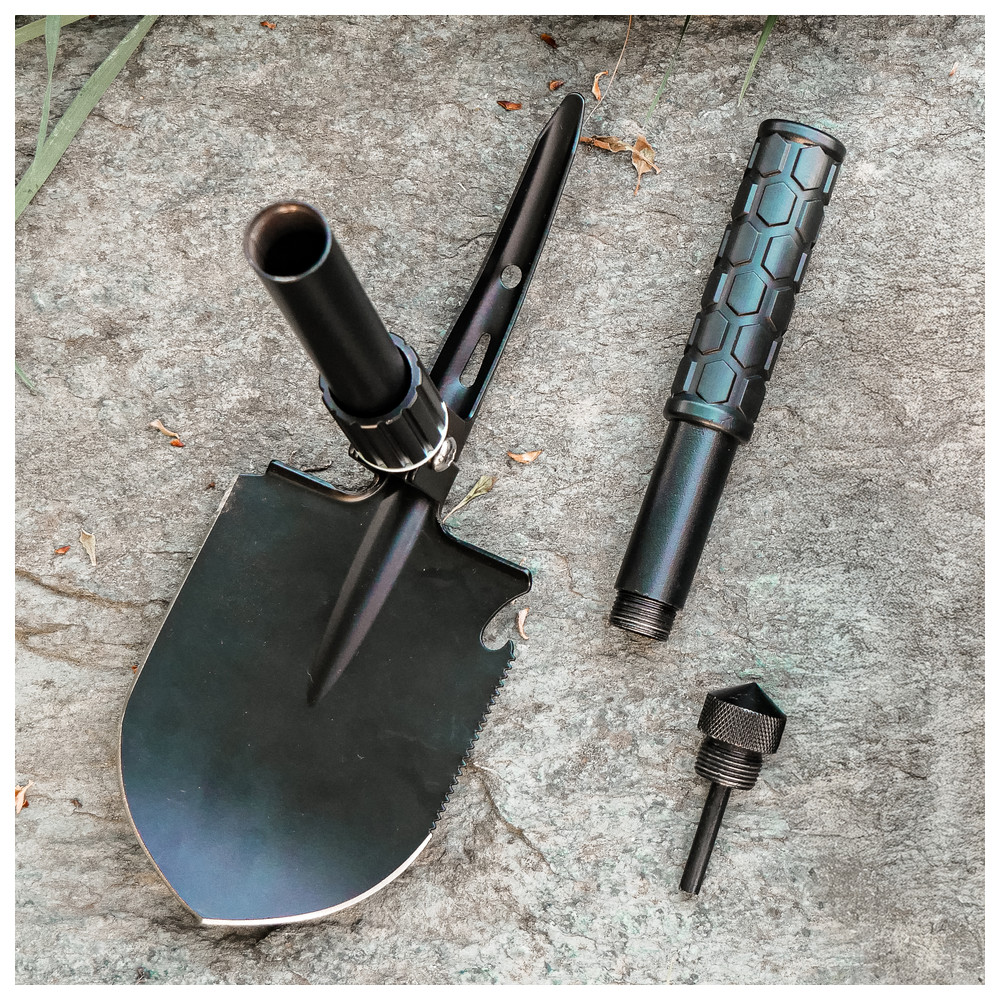 - 7-in-1 Multifunktion - Vereint Schaufel, Hacke, Säge, Feuerstein, Flaschenöffner, Nagelzieher und Glasbrecher in einem kompakten Werkzeug.