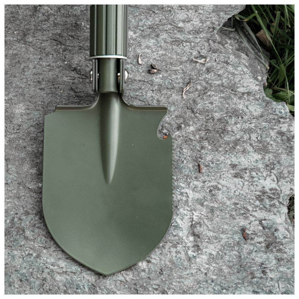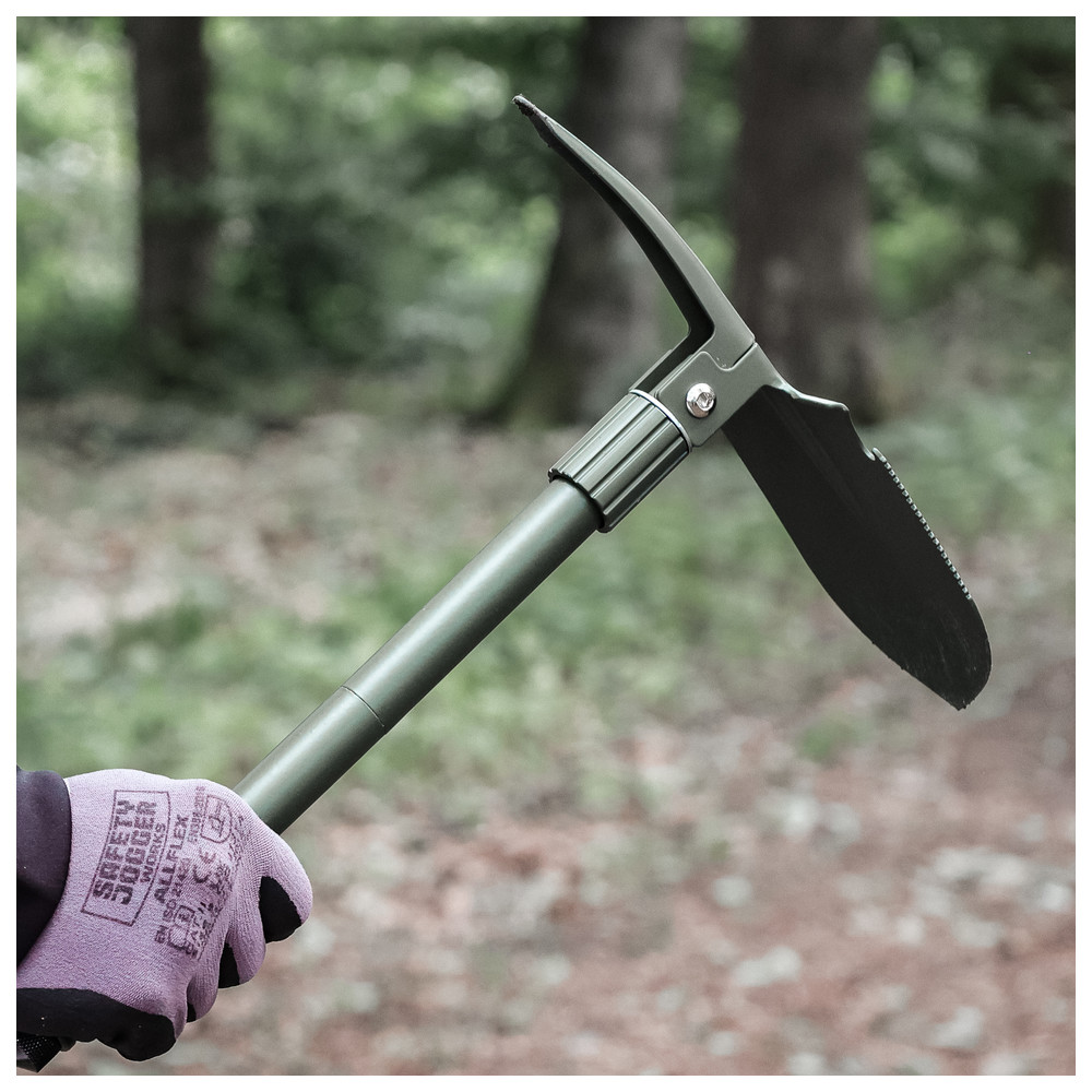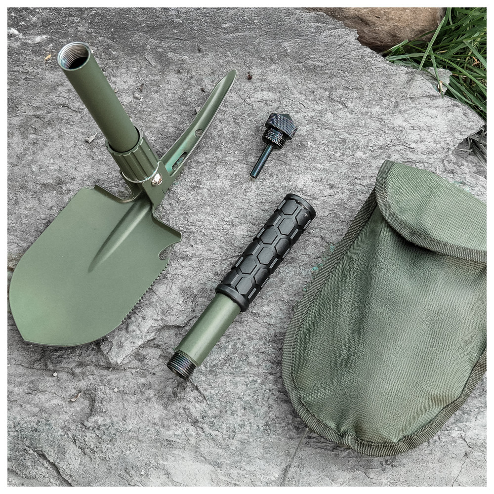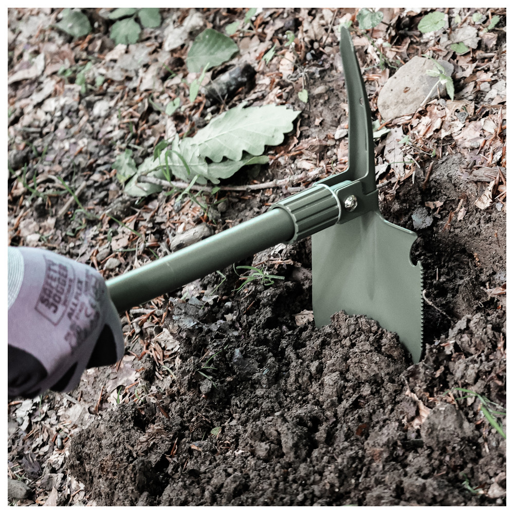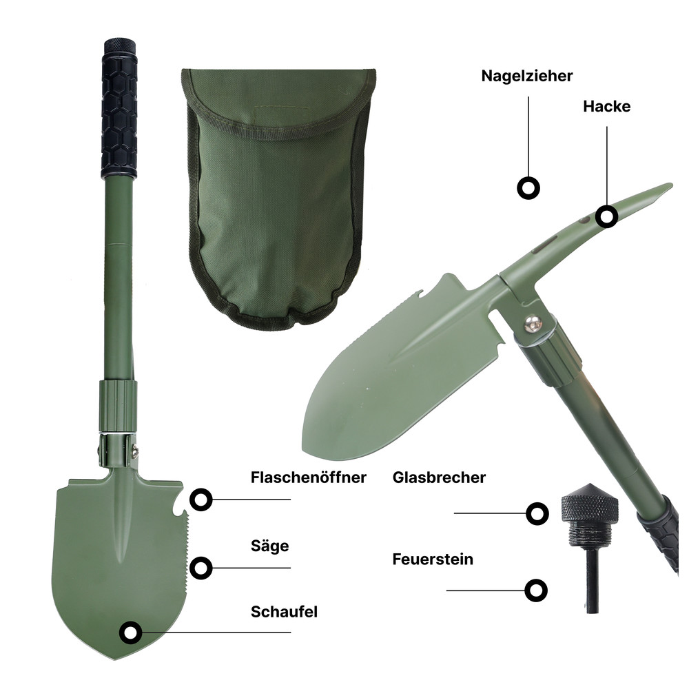 - 7-in-1 Multifunktion - Vereint Schaufel, Hacke, Säge, Feuerstein, Flaschenöffner, Nagelzieher und Glasbrecher in einem kompakten Werkzeug.