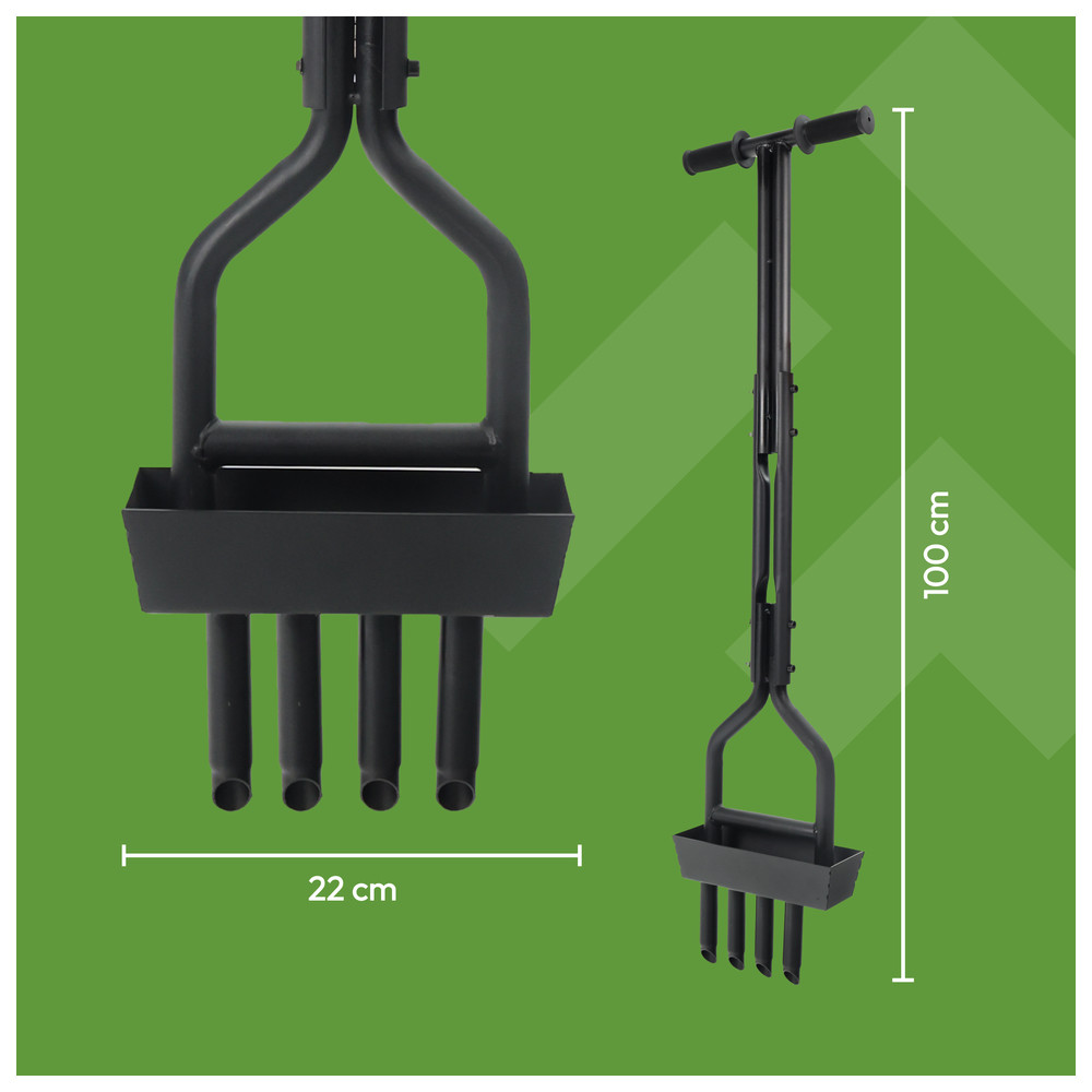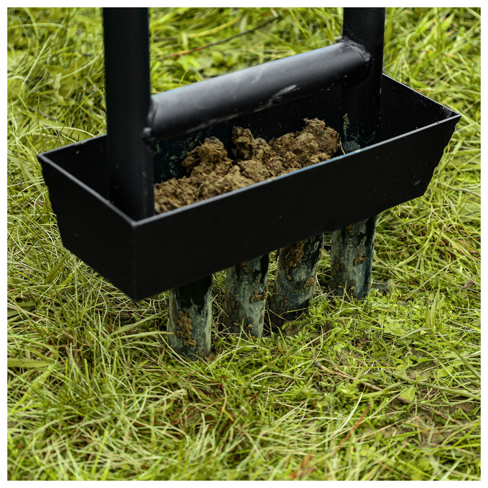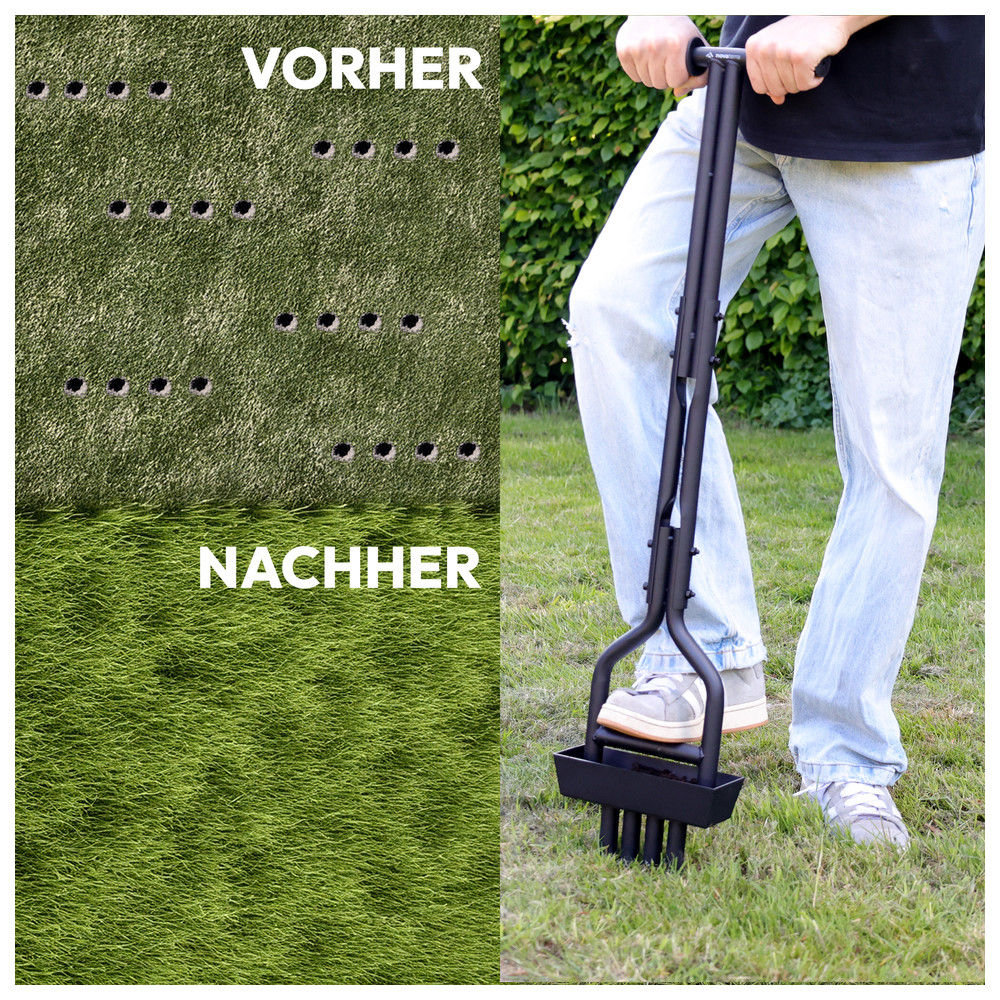 - Effektive Rasenbelüftung für gesundes Wachstum - Vier extra robuste Zinken dringen tief in den Boden ein und lockern selbst harte Erdschichten für eine bessere Nährstoffaufnahme- Sauber & praktisch - Der integrierte Metallrahmen fängt ausgestochene Erdkerne direkt auf und sorgt für eine aufgeräumte Anwendung ohne Schmutz