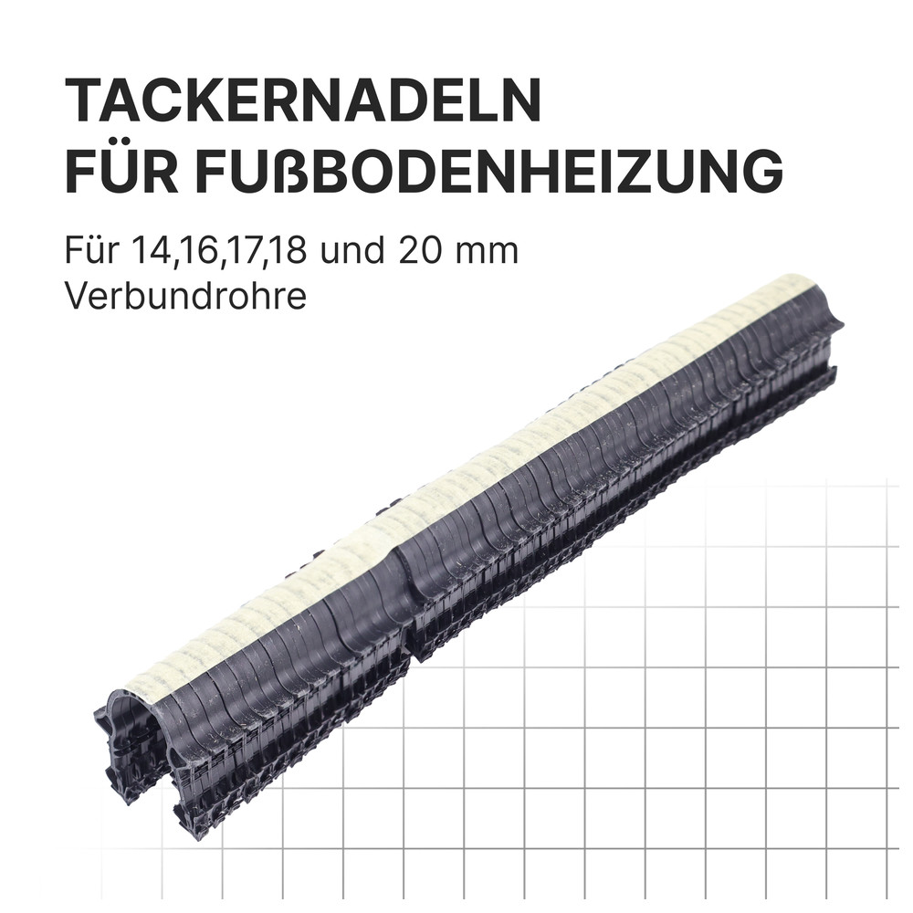 - Premium verklebte Tackernadeln EU-NORM (DIN 1264-4) für 14, 16, 17, 18 und 20 mm Rohre / Verbundrohre zur Montage von Fußbodenheizungssystemen.