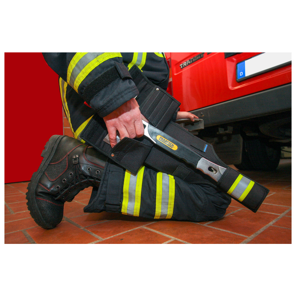 Durch die variablen Einstellmöglichkeiten ist das Spezialholster nicht nur für DIN-Feuerwehrbeile sondern z.B. auch für das Paratech Biel-Tool oder sogar eine Paratech Pry-Axe geeignet. Auch ähnliche Werkzeuge mit einer Stiellänge von ca. 28-40 cm können verstaut werden.