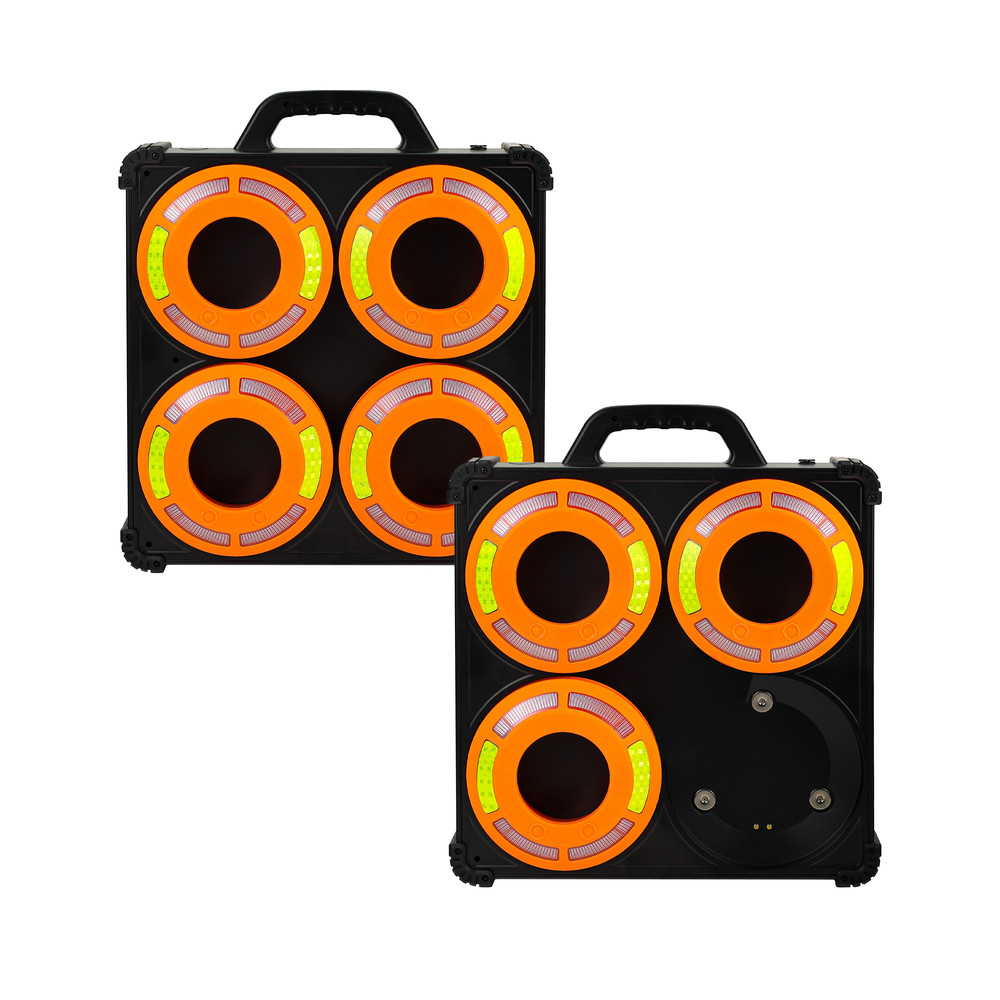 Mit stoßunempfindlicher und wasserdichter Bauweise sind die Leuchten für den robusten Einsatz im Außenbereich bestens geeignet. Eine automatische Aktivierung und Synchronisierung erfolgt direkt beim Entnehmen aus dem Koffer - das spart Zeit und sorgt für sofortige Einsatzbereitschaft.