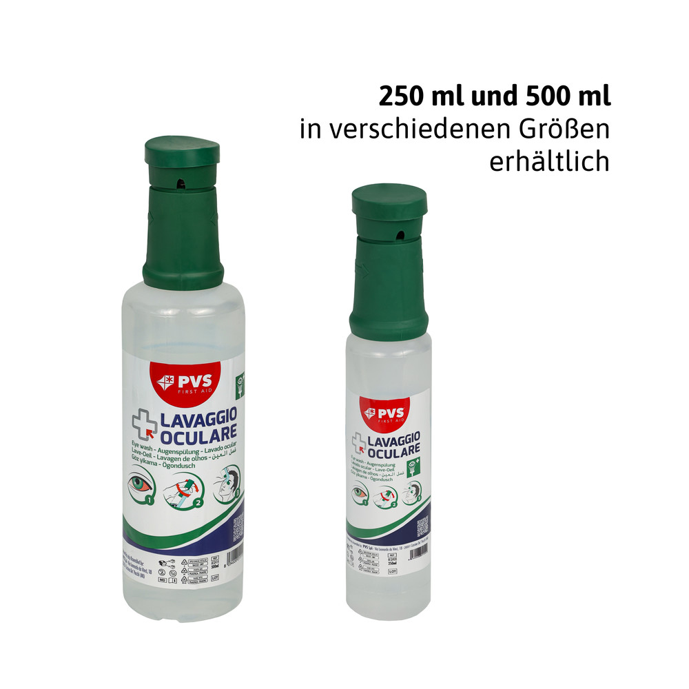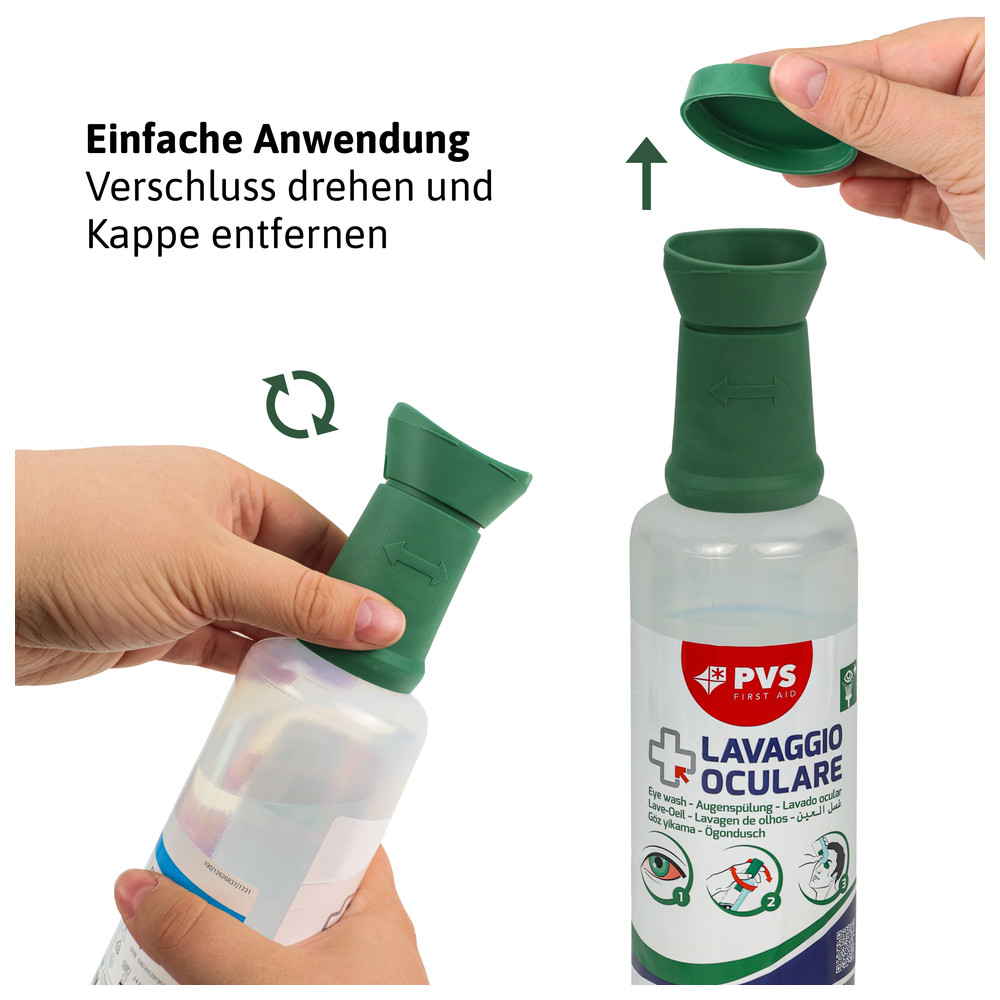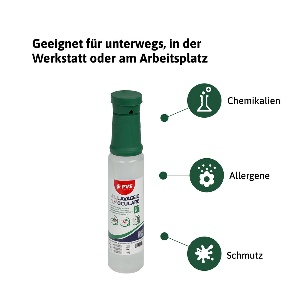 - Die Augenspülflasche ist sowohl dafür verwendbar, eine bereits vorhandene Augenspülstation aufzufüllen, als auch im Einzeleinsatz erste Hilfe zu leisten, egal ob in der Werkstatt, dem Labor, zu Hause oder unterwegs.