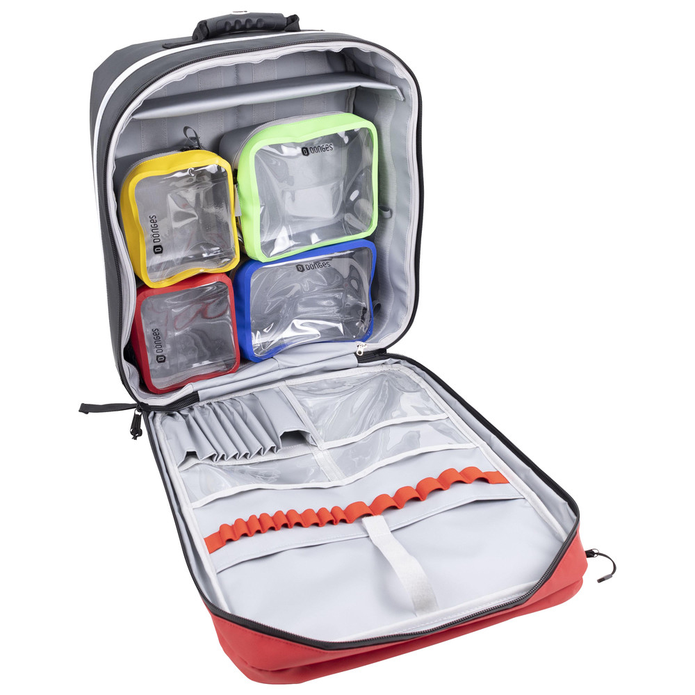 In dem Notfallrucksack können verschiedene Innentaschen in unterschiedlichen Größen und Farben eingeklettet werden. Vier Innentaschen in verschiedenen Farben sind bereits im Lieferumfang enthalten. Der Deckel bietet Platz für Dokumentationen und Kleinmaterial, und ein integriertes Ampullarium für bis zu 12 Ampullen sorgt für Ordnung und schnellen Zugriff auf Medikamente.