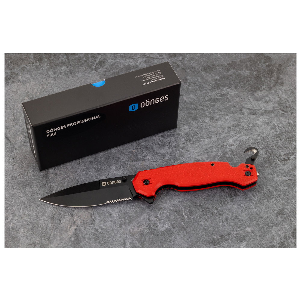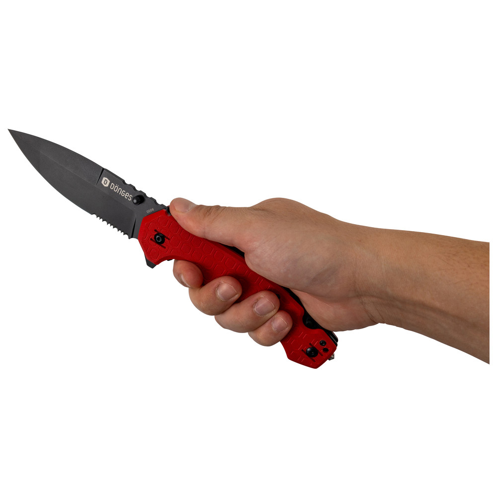 [Multifunctional design with special handle]: Equipped with a belt cutter and glass breaker for versatile rescue operations, the Doenges Rescue Knife Professional is characterised by a handle made of GRP